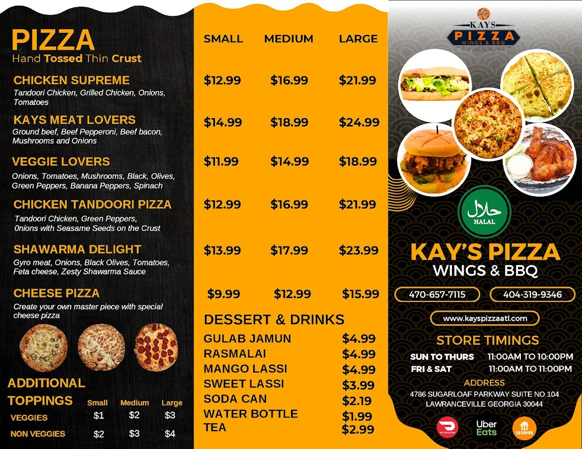 Kay’s Pizza BBQ & Wings حلال is a vibrant, family-owned eatery located in Lawrenceville, GA, specializing in halal cuisine. Offering a diverse menu, they are celebrated for their exceptional pizzas, including a unique tandoori chicken pizza that fuses Indian flavors with classic Italian fare. Diners rave about the juicy cheeseburgers and loaded fries, making it a go-to spot for hearty meals. With an emphasis on cleanliness and friendly service, guests feel warmly welcomed. Kay’s Pizza is not just a meal; it’s a delightful experience that keeps patrons returning for more delicious memories.